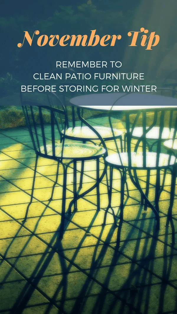 Before storing your outdoor furniture for the winter, take this opportunity to give them a good cleaning so you don't have to do it in the spring, at which point the dirt and grime will be way harder to remove.